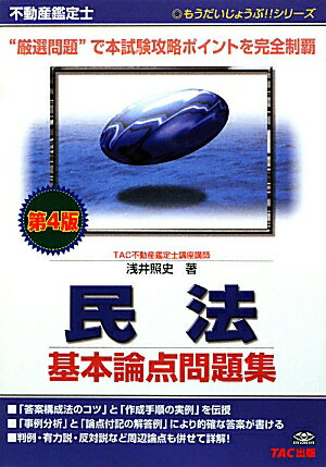 不動産鑑定士民法基本論点問題集第4版 価格: 3,360円 レビュー評価: 0.0 レビュー数:0 商品副データもうだいじょうぶ!!シリーズ浅井照史TACこの著者の新着メールを登録する発行年月:2009年12月登録情報サイズ:単行本ページ数:377pISBN:9784813236245【内容情報】(「BOOK」データベースより)「答案構成法のコツ」と「作成手順の実例」を伝授。「事例分析」と「論点付記の解答例」により的確な答案が書ける。判例・有力説・反対説など周辺論点も併せて詳解。【目次】(「BOOK」データベースより)第1部 合格答案作成法編(不動産鑑定士2次試験民法の注意事項/合格答案構成法ガイド/例題(合格答案作成の実例))/第2部 問題演習編【著者情報】(「BOOK Supported by 楽天ウェブサービス |